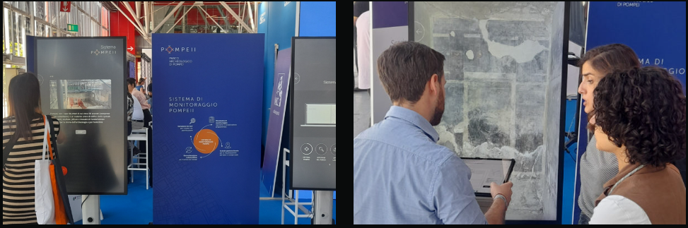 Il Sistema Pompei è stato presentato in fiere prestigiose come la “Borsa Mediterranea del Turismo Archeologico” (BMTA 2023) di Paestum e la fiera “We Make Future” (WMF 2024) di Bologna, con il patrocinio del Ministero della Cultura e del Parco Archeologico di Pompei. Per queste fiere abbiamo progettato un totem interattivo con demo dal vivo, accompagnato da un quiz che, attraverso la gamification, coinvolge attivamente i partecipanti e cattura l’attenzione di un pubblico più ampio, rendendo il Sistema Pompei e la conservazione archeologica più accessibili e stimolanti.